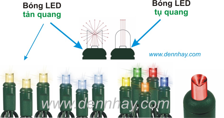 Sử dụng trực tiếp bóng LED Ø5mm loại tản quang, cho ánh sáng tản về nhiều hướng. Phần tiếp xúc giữa chân bóng với dây điện được bọc 1 lớp nhựa PVC đặc biệt để chống nước.